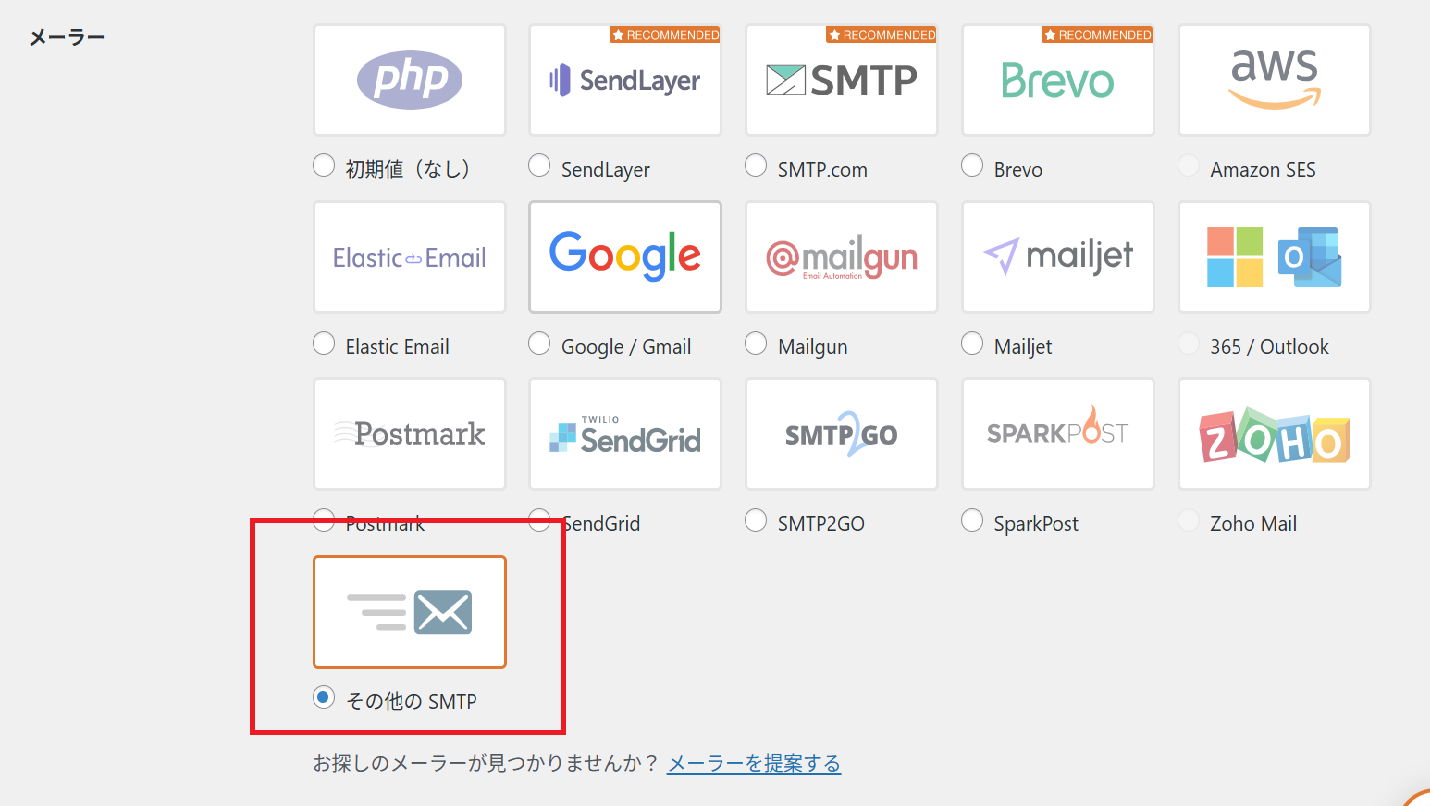 続いて、使用するメーラーを選択します。独自ドメインのメールアドレスを使用している場合は「Other SMTP(その他のSMTP)」を選択することを推奨します。