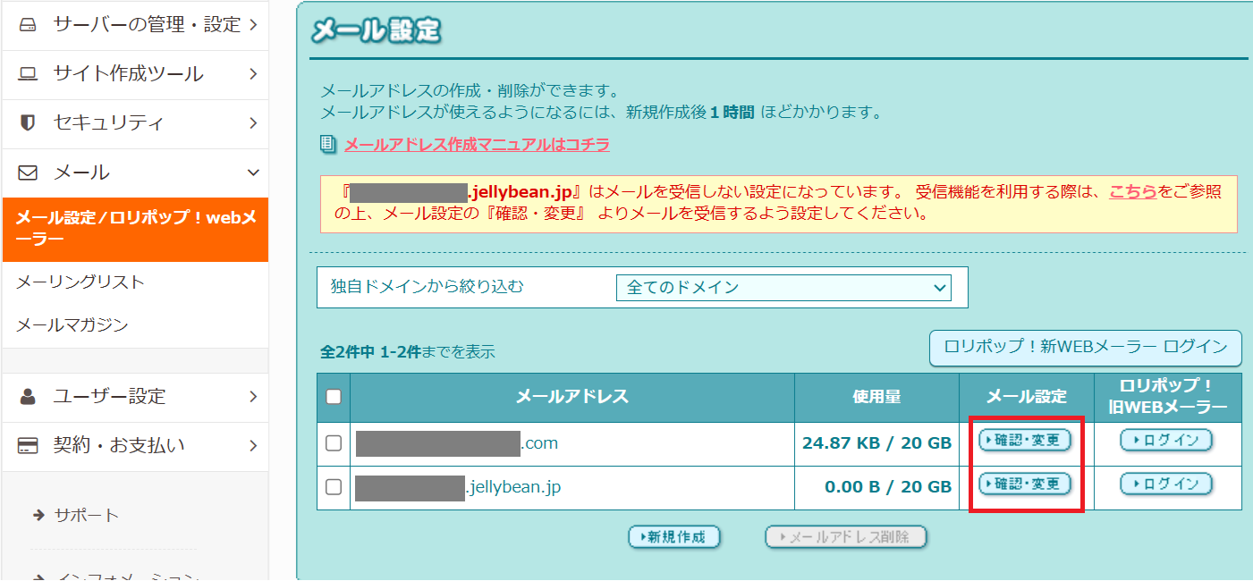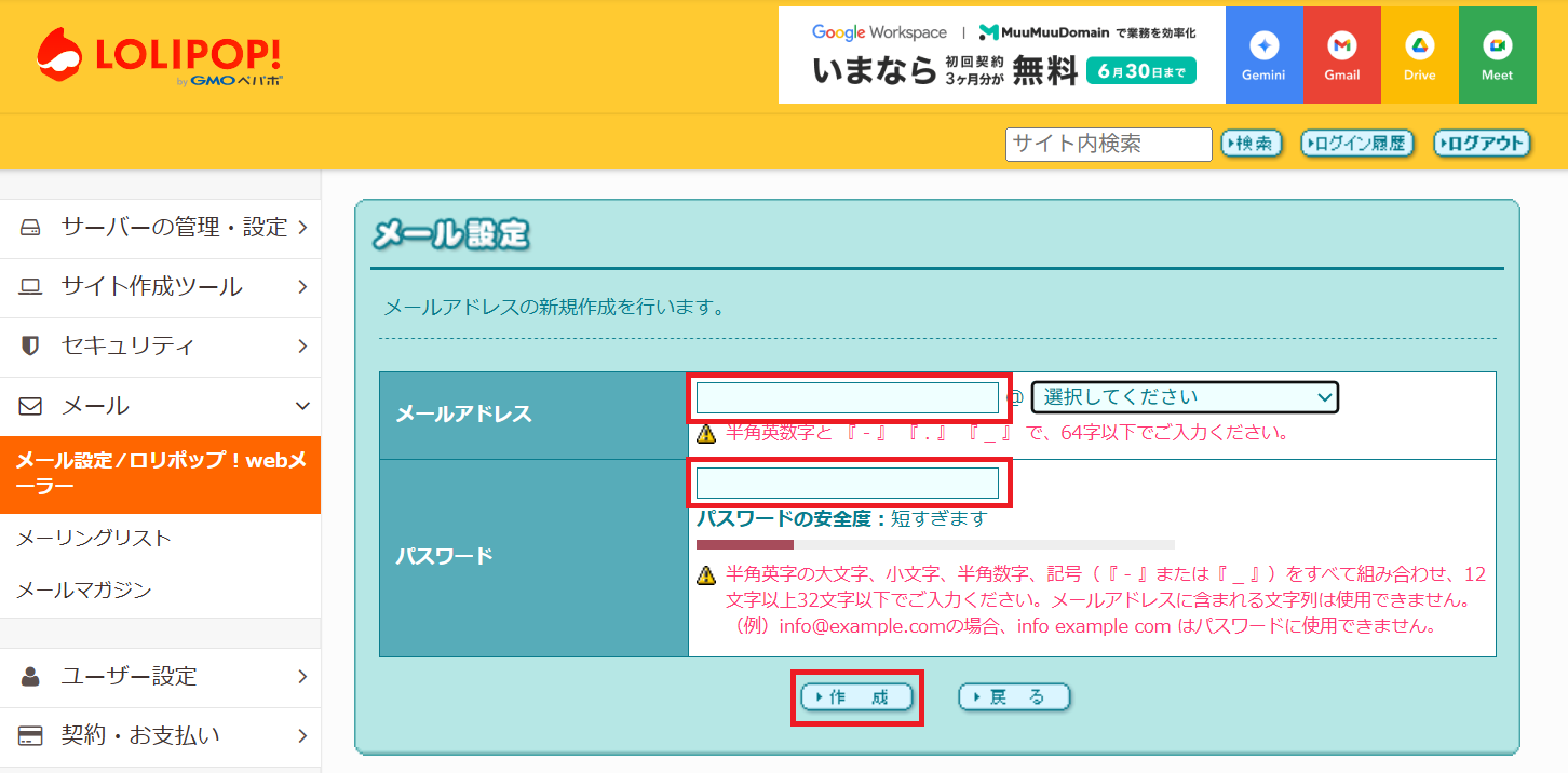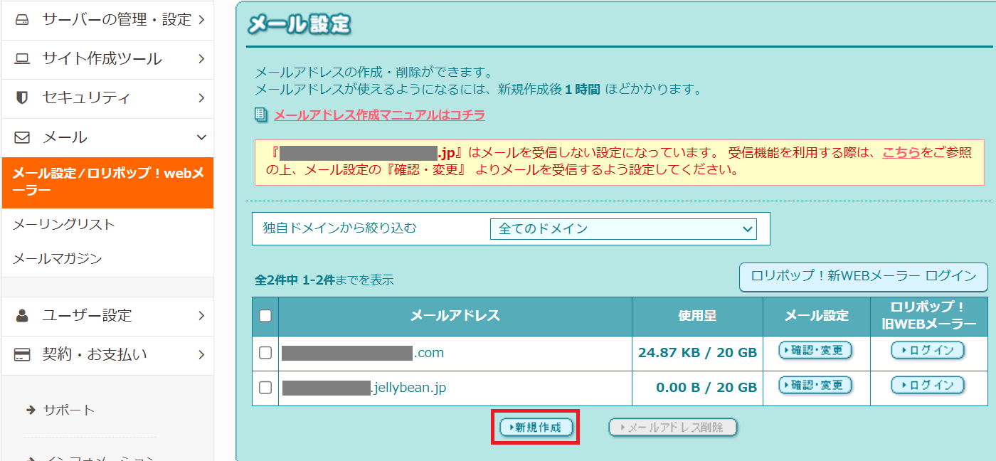 ロリポップの管理画面から「メール設定」→「ロリポップ!Webメーラー」に進み、「新規作成」でメールアドレスを作成します。