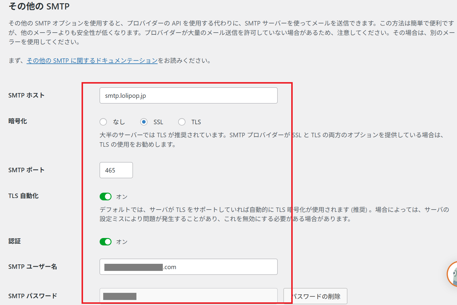 この情報を参考に、WP Mail SMTPの「その他SMTP」の各項目に正しく入力します。