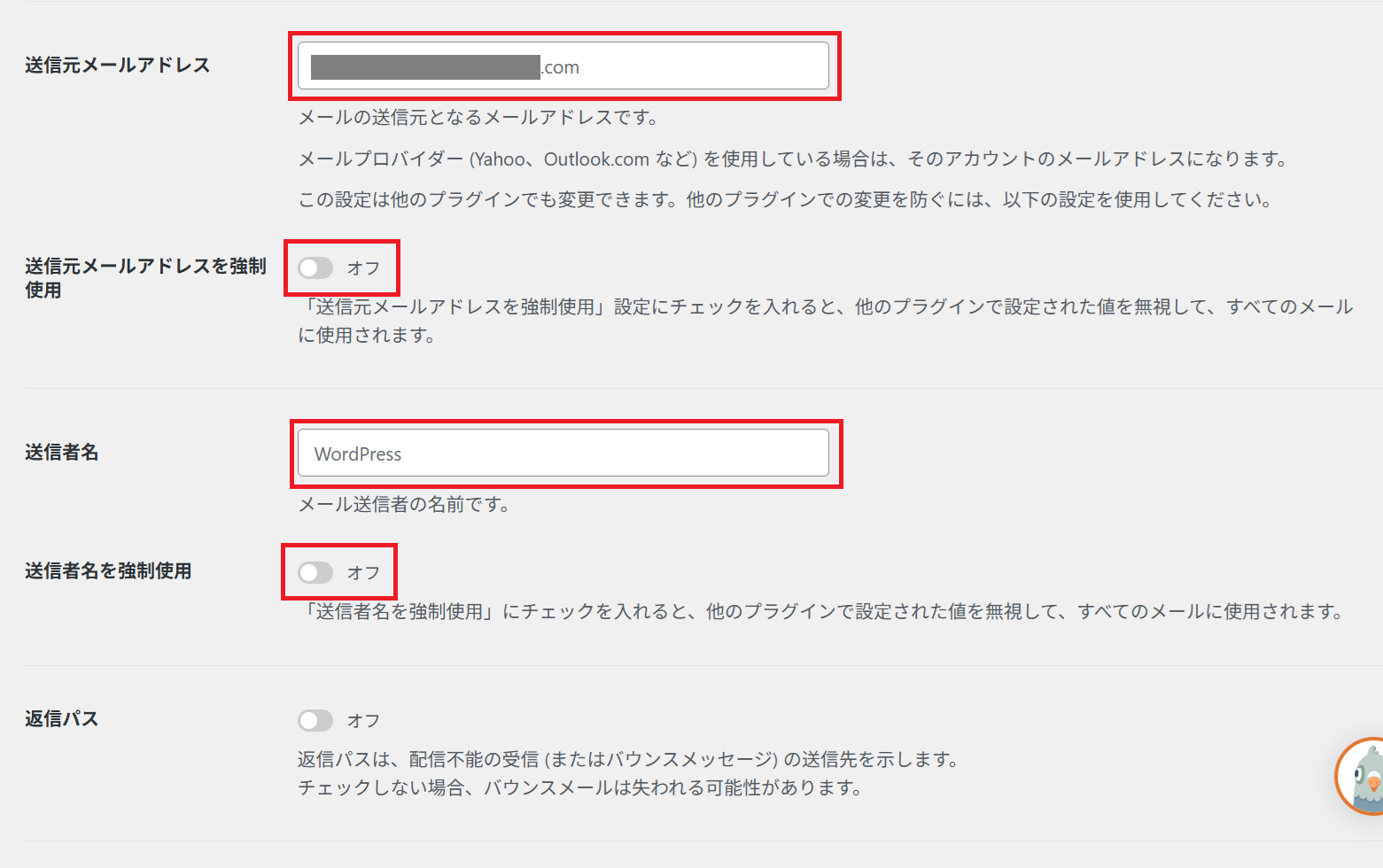 インストール後、WP Mail SMTPの設定画面に移動し、送信元メールアドレスと送信者名を入力します。フォームが1つしかない場合は、この送信元アドレスと名前を強制的に使用する設定(「強制使用」の有効化)をしておくと便利です。