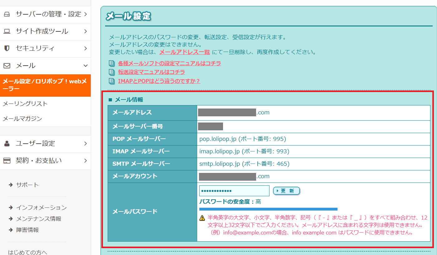 ここで、ロリポップの管理画面に戻り、「メール設定」→「Webメーラー」で対象メールアドレスの設定内容を確認し、SMTP設定に必要な情報(SMTPサーバー、ポート番号、暗号化方式など)を取得します。