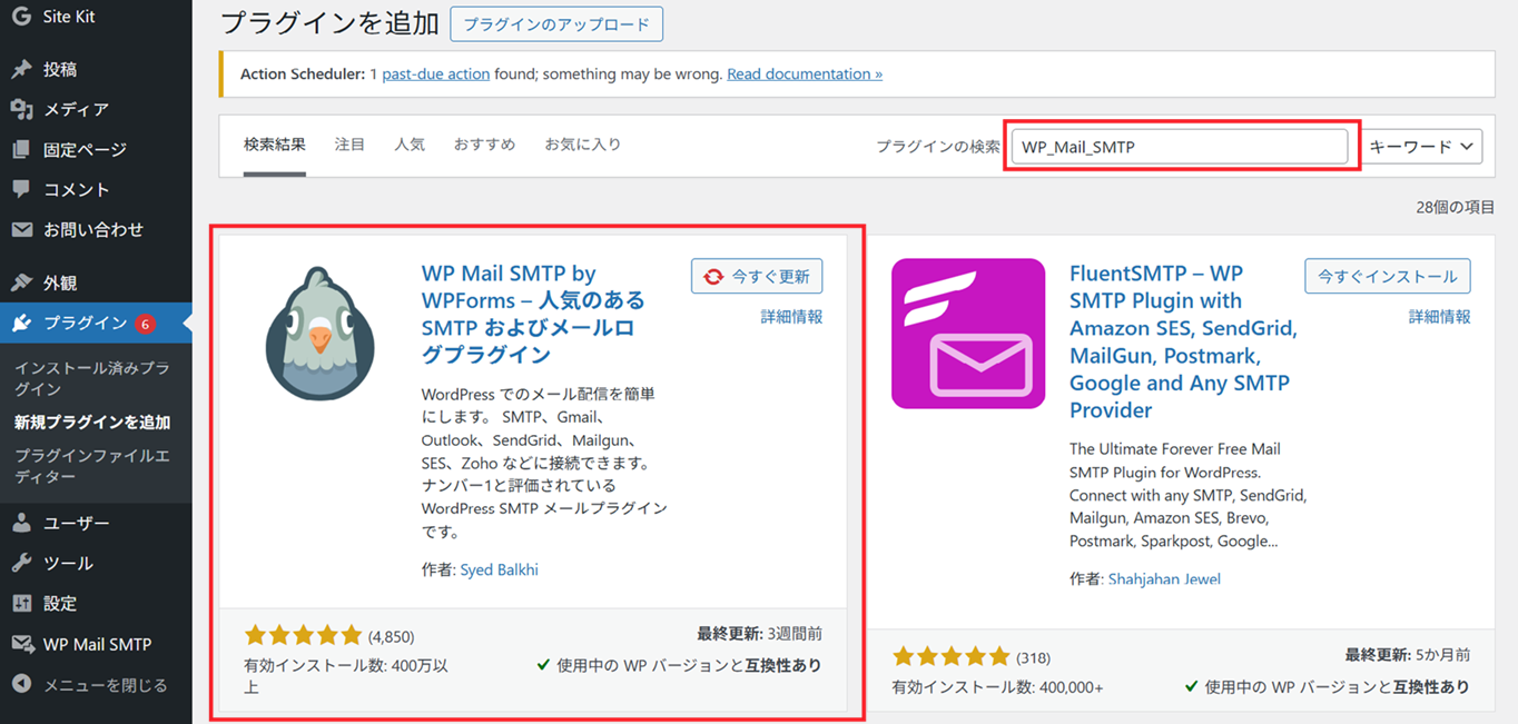 WordPressの管理画面にログインし、「プラグイン」→「新規追加」から「WP Mail SMTP」を検索してインストールし、有効化します。