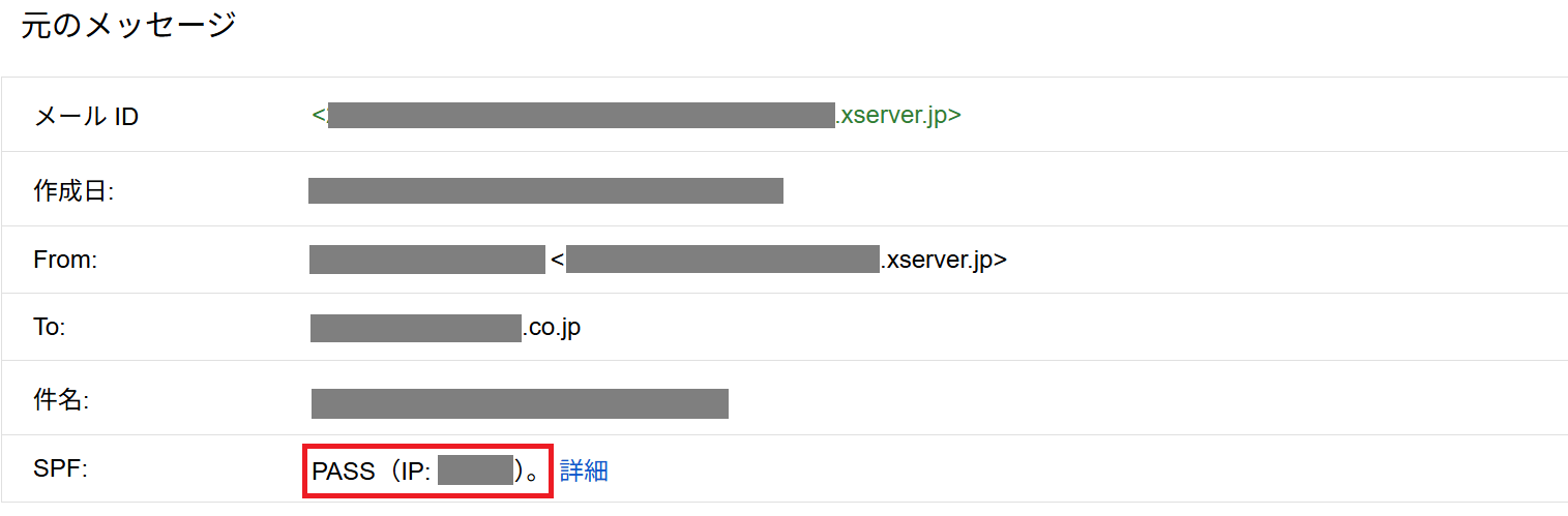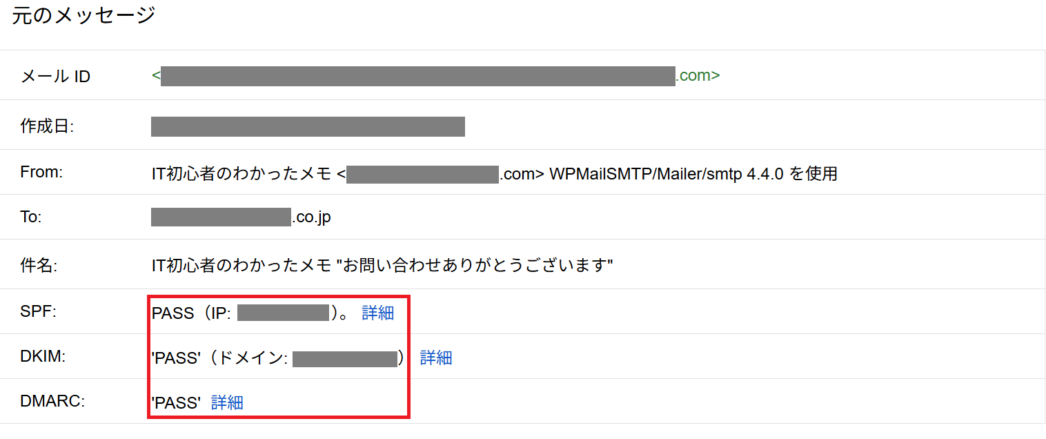 Gmailの「メールの原文を表示」での確認例: 以下の画像では、SPF、DKIM、DMARCすべての認証が「PASS」と表示されており、正常に送信されていることがわかります。