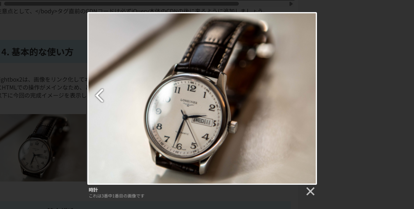 注意点として、</body>タグ直前に追加するLightbox2のCDNコードは、必ずjQuery本体のCDNの後に記述してください。